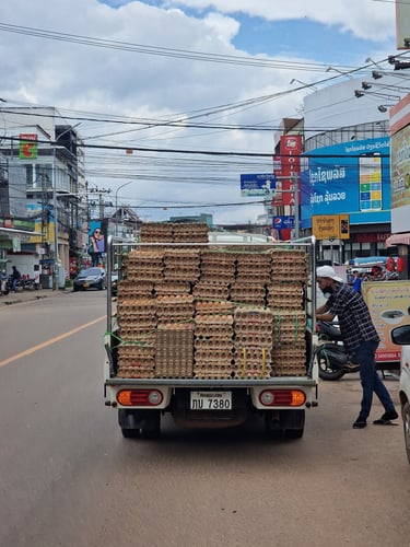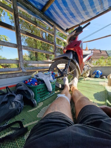 Dreißig Minuten später lag ich also mit Knieverband zwischen Kartons voller Klamotten, dem defekten Roller und einigen weiteren Locals auf der Ladefläche eines kleinen LKW’s und startete die fünfstündige Tour nach Luang Prabang. Dank Schmerztabletten und einer Decke fast schon angenehm, gab es unterwegs neben allerlei Stopps zum Be- und Entladen sogar ein gemeinsames Street-Food-Abendessen, zu dem mich Locals einluden. Auch wenn ich kaum einen Bissen runterbekam, eine wirklich nette Geste beim sicherlich unkomfortabelsten aber gleichzeitig unvergesslichsten Krankentransport meines Lebens.