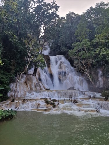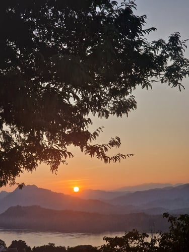 Entsprechend wollte ich keine Zeit verlieren und suchte mir direkt einen Rollerverleih, um den Nachmittag für den Besuch des „Kuang Si Wasserfalls“ zu nutzen, wo ich trotz der wirklich schlechten Straßen auch eine Stunde später ankam. Was ich dabei allerdings nicht auf dem Schirm hatte, waren die Öffnungszeiten des Wasserfalls. Nur bis 17 Uhr! Meine Ankunft 16:30 Uhr und allein der Weg vom Parkplatz zum Wasserfall war mit 30 Minuten angegeben. Whatever, nochmal fahre ich die Stunde nicht und Speed-Wandern ist ja meine Königsdisziplin. 10 Minuten später stand ich also am Ziel und durfte den wirklich wunderschönen Wasserfall fast allein bewundern. Kurz vor knapp hat offensichtlich auch Vorteile! Fast schon umgedreht, fiel mir dann sogar noch ein kleiner Wanderweg auf, der neben dem Wasserfall nach oben führte. Ein Schild gab es zwar nicht, aber mein Bauchgefühl sagte direkt, dass sich der Weg lohnen würde. Und wie! Nach einem kurzen, recht steilen Anstieg eisblaue Naturpools, niemand außer mir in der Nähe und die einmalige Gelegenheit direkt am Rande eines Wasserfalls schwimmen zu können. Natürlich hatte ich die Zeit bei diesem Erlebnis völlig aus den Augen verloren. Mit einer kurzen Klettereinheit kam ich aber auch um 17:30 Uhr über das mittlerweile geschlossene Eingangstor und durfte als Belohnung noch den Sonnenuntergang über dem Mekong genießen.