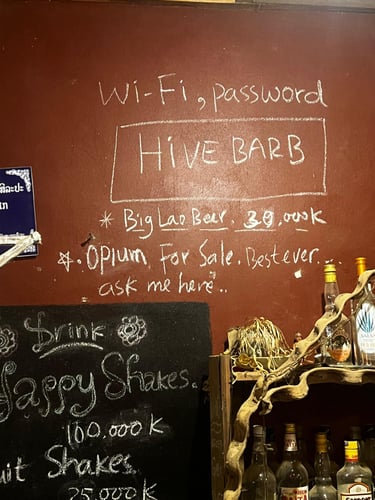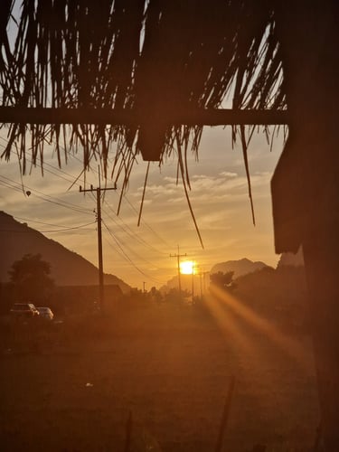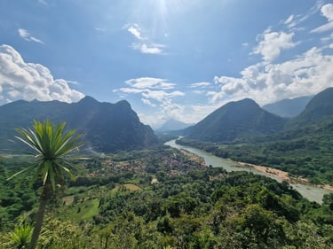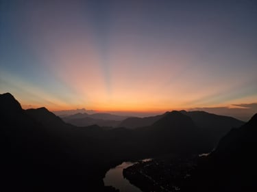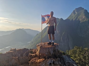 Gleich der erste Sunset vom „Pha Daeng“ war dafür atemberaubend und die knapp 45-miütige Wanderung durch den Dschungel absolut wert. Selbst der Abstieg in totaler Dunkelheit, war dank des klaren Sternenhimmels ein einmaliges Erlebnis und mit Hilfe der Handytaschenlampen eines Holländers und eines Franzosen, die ich auf dem Gipfel getroffen hatte, sogar recht gut machbar. Am nächsten Morgen Bootstour in das noch abgelegenere Muang Ngoy und Besuch des dortigen „Phanoi Viewpoint“. Ebenfalls wunderschön! Als Tagesabschluss mit Josh, einem Engländer aus meinem Dorm in Luang Prabang, zum Abendessen. Food top, restlicher Inhalt der Karte (u.a. Opium) mindestens fragwürdig😅