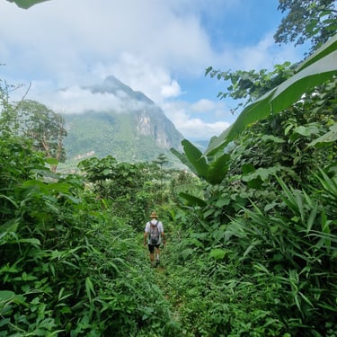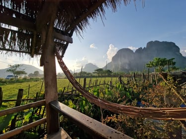 Als ich nach knapp vier Tagen endlich wieder halbwegs stabil auf beiden Beinen unterwegs war, wollte ich dann aber auch weiterziehen, um zumindest Vang Vieng auf meinem Rückweg nach Vientiane noch einen Besuch abzustatten. Bekannt als OG-Backpacker-Partyhochburg im laotischen Nirgendwo stand die Stadt zwar ursprünglich vor allem wegen des legendären Tipsy-Tubing auf meiner Agenda (mit Antibiotika und Wunde keine gute Idee🥲). Weil die umliegende Natur aber auch nüchtern wirklich schön sein soll, wollte ich zumindest ein paar Eindrücke mitnehmen. Neue Cafés waren darüber hinaus eine willkommene Abwechslung, nachdem ich gefühlt jeden Laden in Luang Prabang kannte.