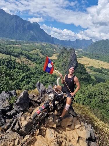 Vier Nächte später hatte ich zwar auch von Vang Vieng genug. Die Stadt hat aber definitiv mehr zu bieten als nur Party. Gleich mein erster richtiger Spaziergang nach dem Unfall führte mich zu einer Sun-Set-Viewbar am Stadtrand, bei der ich die Heißluftballons (Vang Vieng-Classic) vorm Sonnenuntergang mit Cola und Hängematte mehr als nur genießen konnte. Angefixt von der tollen Landschaft ging es am vorletzten Tag sogar mit E-Roller (unfallfrei) zu einem der vielen Viewpoints in der Nähe der Stadt. Auch wenn die Aussicht das eigentliche Highlight ist, wollte ich den „Nam Xay Viewpoint“ vor allem wegen einer (fast ironischen) Besonderheit auschecken. Auf dem Gipfel gibt es zwei Motorräder! Knapp sieben Tage nach dem Motorrad-Unfall der beste Spot um auf meine ganz eigene Art, endlich wieder nach vorne zu blicken.