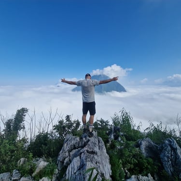 Ziemlich begeistert von Nong Khiaw blieb für den Morgen des dritten Tages nur noch eine Challenge übrig. Der höchste (zugängliche) Viewpoint in der Umgebung auf dem Gipfel des „Pha Kao“, ohne den ich nicht gewissenfrei weiterziehen hätte können. Die Informationen im Internet waren zwar spärlich aber ausreichend, um zumindest den Startpunkt zu finden. Josh hatte ich zwischenzeitlich ebenfalls motiviert, sodass wir uns um 7 Uhr morgens gemeinsam auf den Weg machten. Anfangs alles recht simpel, wurden wir das erste Mal stutzig, als der offizielle Wanderweg mit einer Art provisorischem Zaun blockiert war. Unbeeindruckt davon setzten wir unseren Weg natürlich fort. Aufgrund des schlechter werdenden Pfades und des dichter werdenden Dschungels beschlich uns aber zunehmend das Gefühl, dass der Weg schon seit längerem nicht mehr genutzt wurde. Auch die Wegfindung wurde deutlich schwerer und insbesondere meine Wenigkeit war von den unzähligen Spinnen auf dem Weg nicht gerade begeistert. Als wir nach über zwei Stunden endlich in Gipfelnähe kamen, war der Weg dann völlig verschwunden, weil anscheinend ein Unwetter wenige Tage zuvor sämtliche Bäume ausgerissen hatte. Erst beim letzten Versuch vorm Umkehren konnten Josh und ich den eigentlichen Pfad wiederfinden und standen wenige Minuten später finally auf dem Gipfel mit einem unglaublich pittoresken Panorama über einem Meer aus Wolken. Natürlich ganz allein! Der Weg war nämlich offiziell tatsächlich gesperrt, weil das Unwetter auch die Hütte auf dem Gipfel zerstört hatte. Uns war’s egal und meine Mission in Nong Khiaw war erfüllt.