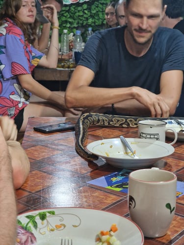 Und auf zwei Rädern. Denn Vermissung Nummer 2 waren nach drei Monaten Australien und Ozeanien ganz klar planlose Roadtrips auf Rollern für drei Euro am Tag. Zusammen mit zwei sehr fotobegabten Belgiern vom Hostel wurde so der erstbeste Vulkan bei Maps rausgesucht und einfach losgedüst. Keine Probleme, Lunch für 2,50 €, Fahrtwind, 30 Grad und am Ende sogar echt schicke Aussichten. Spätestens als die Hostel-Besitzerin abends zum Dinner dann zwei ihrer Schlangen mitbrachte und die Tiere zwischen Uno-Karten, Resten von Nasi-Goreng und den maximal irritierten Gästen rumkrochen, war klar: Südostasien, ich bin zurück!