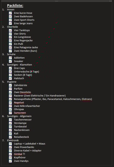Last but not least musste dann natürlich noch der fürs Backpacking obligatorische Rucksack gepackt werden. Hierfür hatte ich mir die letzte Woche bzw. die letzten Tage vor der Abreise eingeplant. Hört sich erst einmal ziemlich knapp an, dachte ich. Zwischen Mallorca, Osteuropa, Festival und anderen Events war allerdings auch wenig Platz im Terminkalender und im Verzichten war ich schon immer schlecht. Also wurde kurzerhand in Step-1 gedanklich überlegt, was unbedingt neu gekauft werden muss und somit zeitlichen Vorlauf benötigt. Im Wesentlichen gab es hier nur einen Laptop, einen Packsafe, neue Packing-Cubes und kleinere Technik-Gadgets. In Step-2 wollte ich danach eine klassische Packliste erstellen, nochmals prüfen, ob etwas fehlt, Feedback vom Kumpel auf Reisen einholen, alles in Ruhe einpacken und letztlich hoffen, dass es passt. Wollte, weil Step-2 im Endeffekt irgendwie zwischen Weinproben, Spaziergängen und entspannten Abenden am See erledigt wurde. Als Konsquenz war der Backpack am letzten Tag vor der Abreise immer noch nicht wirklich gepackt. Naja, whatever. Am Morgen der Abreise ging es irgendwie mit zwei gepackten Rucksäcken (Gesamtgewicht ca. 14kg) und einer im Handy vollständig abgehakten Packliste (bisher wird noch nichts vermisst) zum Airport; Team Last-Minute eben 😎