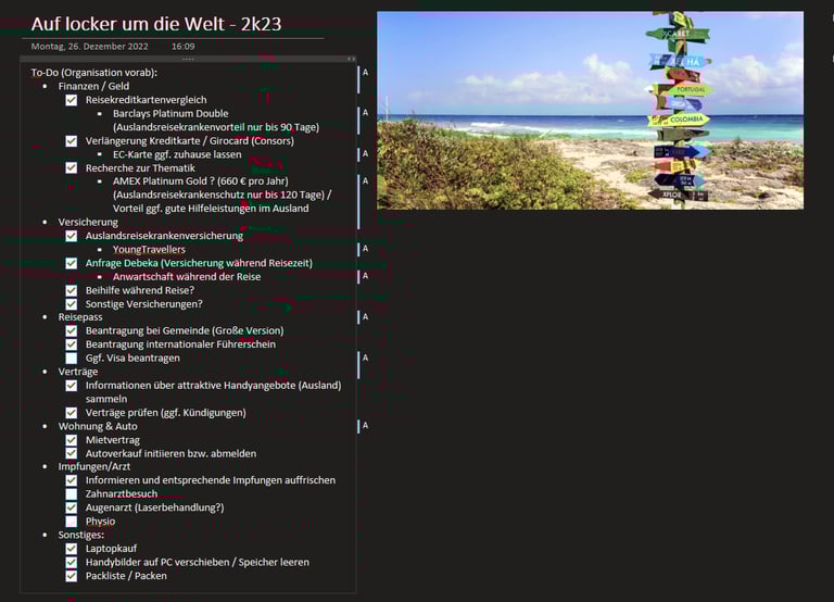 Naja... 128.000 Ergebnisse und überall der Tipp, mindestens 12 Monate vorher anzufangen. Ich hatte noch relativ genau 6 Monate😅! Nach der ersten kurzen Panik war dann aber schnell klar, so viel Zeit brauchst du gar nicht. Das einzige, was wirklich frühzeitig zu klären ist, ist der Zeitpunkt der Reise und die entsprechende Absprache im Job. Hier hatte ich ja bereits vorgearbeitet und insofern konnte entspannt die erste Kurzübersicht, die ich zuvor schon bei OneNote angelegt hatte, als To-Do-Liste erstellt werden. Von Autoverkauf über Versicherung bis Impfung war zwar trotzdem eine ganze Menge dabei. Aber vieles davon musste nicht überstürzt werden. Relativ schnell hatte ich im Kopf eine grobe Zeitplanung. Team Last-Minute war zurück!
