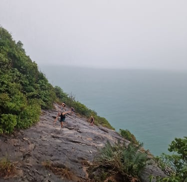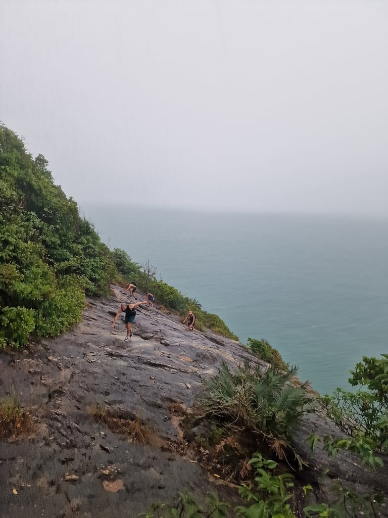 Weitergehen und auf einen besser werdenden Pfad hoffen. Für den Rückweg vom Bottle Beach ein Water-Taxi nehmen! Nach kurzer Diskussion stand der weitere Plan fest. Weil wir laut Maps zudem bereits die Hälfte des Wegs geschafft hatten, wurde die Laune auch wieder etwas besser. Einen Schweden und eine weitere Belgierin, die wir wenige Minuten später bei einer recht ähnlichen Diskussion trafen, nahmen wir spontan in unsere Gruppe auf und setzten unsere Wanderung dann zügig fort. Zügig, bis der Weg auf einem riesigen Felsen an der Küste endete, die Schlappen der neu aufgenommenen Belgierin rissen und der Regen wieder stärker wurde. Völlig durchnässt standen wir jetzt also zu fünft im Nirgendwo. Ohne Weg, Empfang, Plan und teilweise ohne Schuhe…