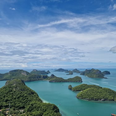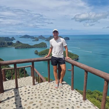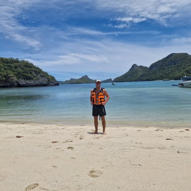 Weil zu viel Ruhe bekanntermaßen nicht mein Ding ist, war für den nächsten Tag aber mal wieder ein aktiveres Programm angesetzt. Auf Google-Maps hatte ich den „Ang Thong National Marine Park“ entdeckt und nach kurzer Recherche für so interessant befunden, dass ich mich in eine ganztätige (nicht ganz günstige) Tour mit Guide eingebucht hatte. Das sonst von mir präferierte Entdecken „Auf eigene Faust“ war hier ausnahmsweise nicht möglich, weil „Ang Thong“ nur per Boot zu erreichen ist. Immerhin gab es für das Geld Hostel-Pick-Up, Frühstück und ganztätige Versorgung mit Drinks und Food. Vor allem aber gab es den für mich bisher schönsten Spot in ganz Thailand. Neben Schnorcheln, Kajak-Tour und viel Zeit im Speedboat war auf der Tour nämlich ein Stopp auf Koh Wua Talap inkludiert. Der dortige View-Point hatte bei bestem Wetter ein unglaubliches Panorama über den „Ang Thong Marine Park“ zu bieten, das so auch in diversen Thailand-Werbe-Videos gefunden werden kann. Die knapp 30-minütige Wanderung, die man vermutlich eher als 30-minütiges Treppensteigen bezeichnen sollte, waren am Viewpoint sofort vergessen. Dank Stan, einem Holländer, den ich auf der Tour kennengelernt hatte, gab es sogar mal richtige Erinnerungsfotos anstelle der sonst üblichen Selfies. Absolute Empfehlung!