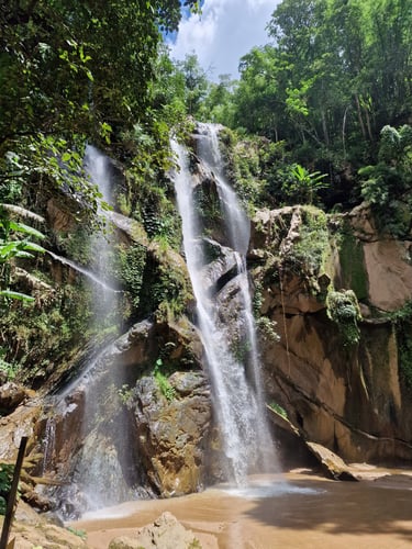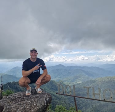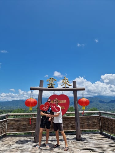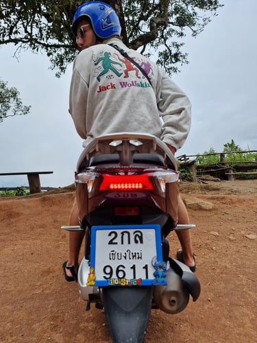 Day 2 in Chiang Mai startete dann nach dem obligatorischen Frühstück im Café (Chiang Mai hat endlos viele gute Cafés, "Goodsouls Kitchen - Vegan Restaurant" aber meine absolute Nr.1) beim Rollerverleih. Bevor wir den Loop fahren wollten, galt es nämlich erstmal meine Roller-Driving-Skills aufzufrischen, nachdem mein letzter Roller-Ride im Sommer 2022 in Griechenland mit einem Unfall endete (Grüße gehen raus an Bene✌️😅) und ich seitdem nicht mehr gefahren war. Im thailändischen Verkehr gab es als zusätzliche Schwierigkeiten Links-Verkehr und allgemein sehr wenig Beachtung der geltenden Verkehrsregeln. Etwas ungewohnt und anfangs noch ziemlich vorsichtig hatte ich dank Jannik und Lisa aber schnell verstanden, dass man hier nur vorankommt, wenn man einfach fährt, wo Platz ist; egal ob links oder rechts vorbei, egal ob Straße oder Bürgersteig. Biste Assi, biste König! Also auf (un-)entspannt ein bisschen durch die Stadt gefahren, die obligatorischen Tempel besichtigt und meine erste Thai-Massage gegönnt. Nachdem am nächsten Tag auch die Fahrt in die naheliegenden Berge (in deutschen Fahrschulen you call it "Überlandfahrt"), wo wir das wunderschöne "Hmong Doi Pui Family Coffee" besucht hatten, unfallfrei überstanden wurde, war ich offiziell bereit für den Loop.