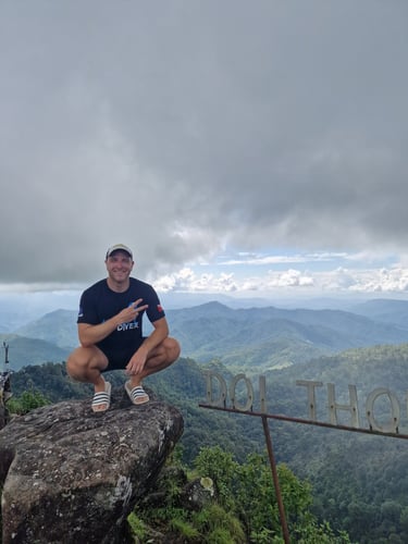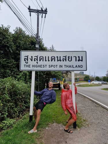 Also umdrehen? Natürlich nicht! Weil der Weg offensichtlich weiterging und wir das Schild noch in Erinnerung hatten, setzten wir uns wieder auf den Roller und fuhren einfach der Straße nach. Ohne Google Maps heutzutage schon ein leicht komisches Gefühl, wurde die Straße zu einem absoluten Abenteuer-Drive. Enge Serpentinen durch dichten Dschungel, zunehmend stärkerer Regen und weit und breit kein anderer Roller. Die über 1000 Höhenmeter in relativ kurzer Distanz brachten die 125er-Roller dermaßen an ihre Grenze, dass zeitweise bei Vollgas geschoben werden musste, um voranzukommen. Irgendwie kamen wir dann aber doch oben an, konnten zwischendrin am ersten View-Point während des Wartens auf die Sonne sogar eine Cola kaufen und hatten nach einer kleinen Wanderung für die letzten Meter eine Wahnsinns-Aussicht vom "Doi-Thong-Viewpoint".