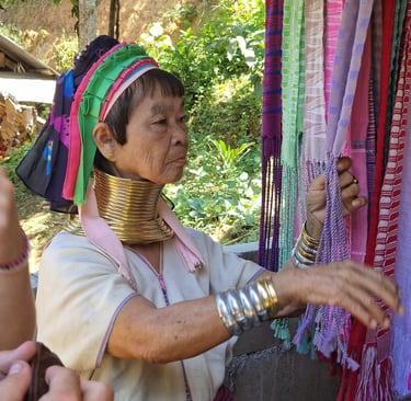 Im von uns besuchten, besonders abgelegenen Dorf ("Kayan Taryar"), gab es glücklicherweise keinen Eintritt. Dafür war bereits der Weg eine ziemliche Erfahrung. Vor Ort waren wir die einzigen Touristen und fanden anfangs statt "Long-Neck-Frauen" eine Art "Waisenheim" in dem uns ein superfreundlicher Kayan-Mann bei einer Tasse Tee auf Englisch erzählte, wie sie vor Ort versuchen, für die Kinder und Waisenkinder in den Dörfern Bildung zu ermöglichen und die sehr einfachen Lebensumstände etwas zu verbessern. Gleichzeitig erfuhren wir von ihm, dass seine Mutter, die ebenfalls im Dorf lebte, die letzte traditionelle Long-Neck-Frau im Dorf wäre. Für die jüngeren Frauen wäre das Tragen der Ringe freiwillig und kaum noch "im Trend". Ziemlich beeindruckt von der Gastfreundschaft und dem authentischen Bildungsprojekt um das Waisenhaus, ließen wir unaufgefordert ausnahmsweise sogar einen etwas großzügigeren Betrag als Dank für den Tee und Spende für das Projekt da.
