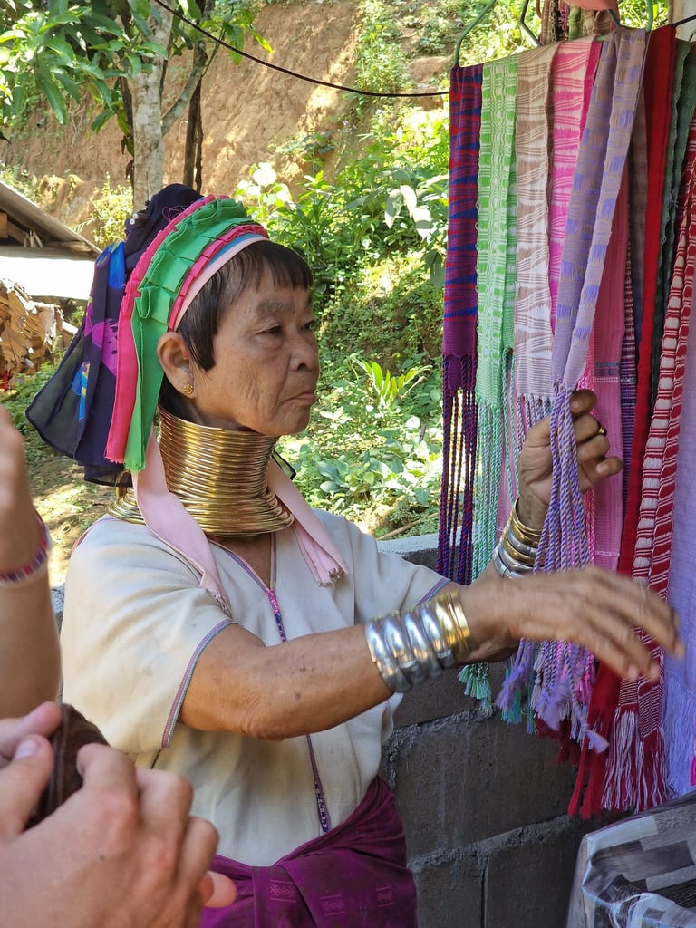 Am dritten Tag hieß es dann wieder Meter machen, um nach Mae Hong Son zu kommen. Ohne Umwege schon eine ca. dreistündige Tour saßen wir wegen eines Stopps beim "Noodle Soup House Ban Jabo" (absolute Empfehlung wegen der Aussicht) und einem Abstecher zur myanmarischen Grenze (schreibt man das so?) im sehenswerten Örtchen Ban Rak Thai insgesamt fünf Stunden auf dem Roller. Am nächsten Morgen stand dann ein Besuch in einem sog. Long-Neck-Village an, die in der bergigen Grenzregion zu Myanmar vereinzelt zu finden sind. In den Dörfern leben Angehörige der aus Myanmar vertriebenen Kayan-Minderheit, bei denen die Frauen teilweise die traditionellen Halsringe zur Halsverlängerung tragen. Da die Dörfer von Thailand keine finanzielle Unterstützung erhalten, verkaufen die Kayan Schmuck und andere Souvenirs an Touristen, um Geld zu verdienen oder nehmen Eintritt.