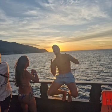 Natürlich wollte ich in KohTao nicht nur rumhängen und feiern. Neben dem üblichen Chillout im Revelution gab es deshalb auch einige Activities. Fun-Diving an einem erst kürzlich versenkten Marineschiff, eine Wanderung zu einem verlassenen Hostel im Dschungel, Schnorcheln mit Riffhaien und jede Menge gutes thailändisches Food. Nicht zu vergessen natürlich auch die absolut geile Revelution Boat-Party ("BoozeCruise"). Bei traumhaftem Wetter mit 50 Personen den ganzen Nachmittag auf einem Boot. Dazu DJ, Drinks, Schnorcheln und ein unglaublicher Sunset. Spätenstens in diesem Moment war für mich klar, dass nach den vier Nächten auf Koh Tao noch nicht Schluss sein kann. Ich war im Hole.